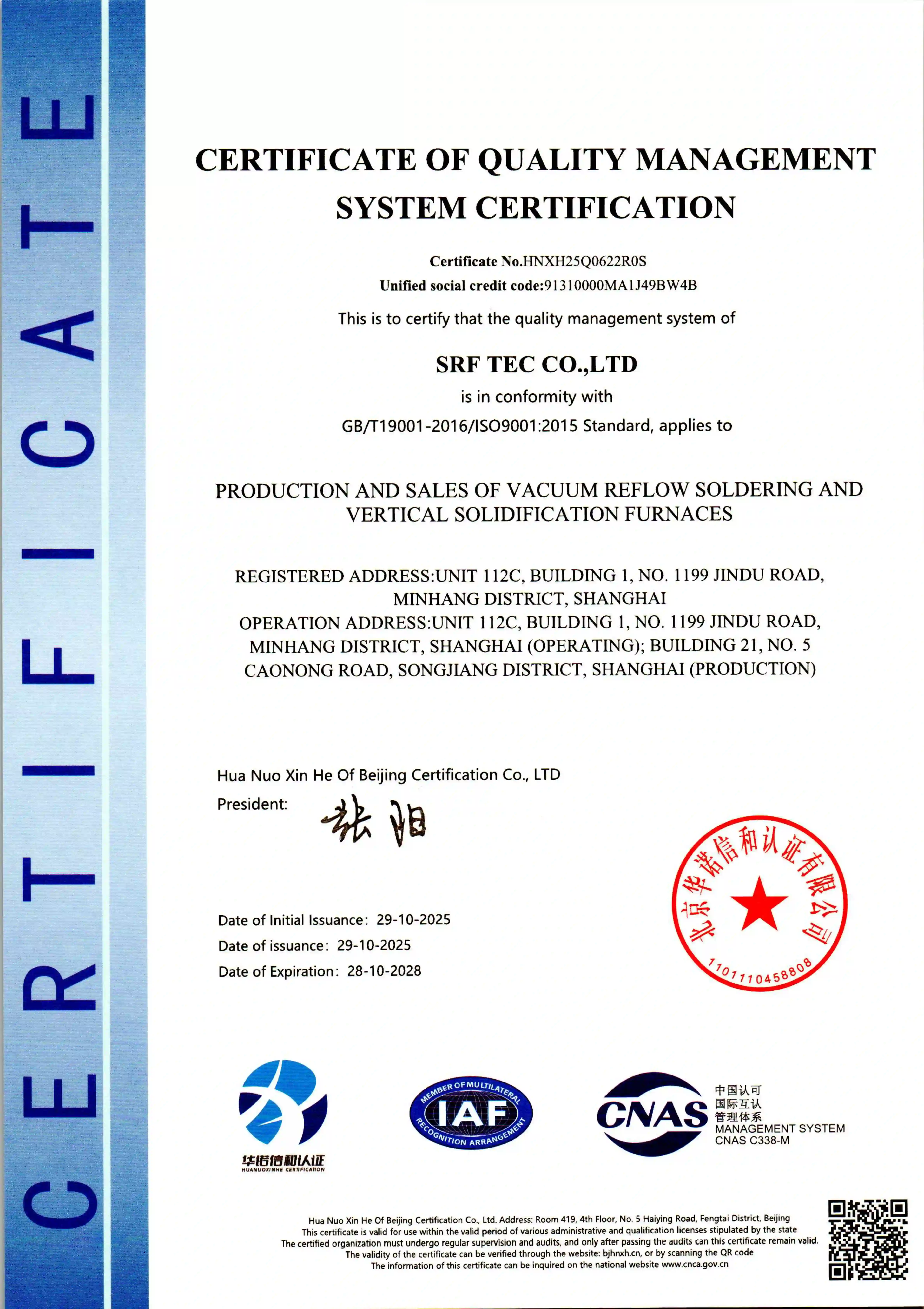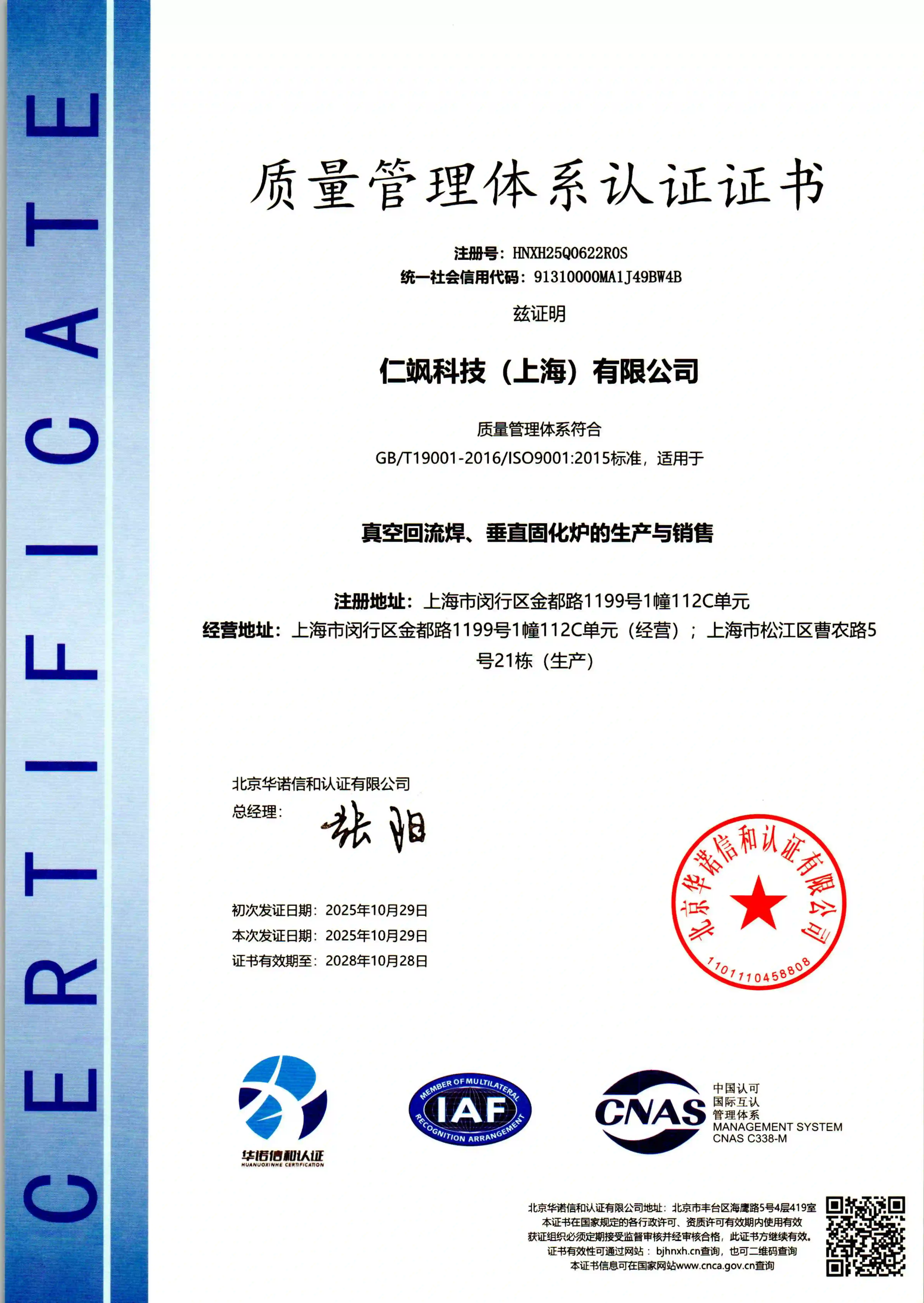 仁飒科技于10月29日正式斩获ISO9001质量管理体系认证证书。作为专注真空回流焊、垂直固化炉研发生产与销售的企业,此次认证标志其在设计、生产及服务全流程实现标准化管控。